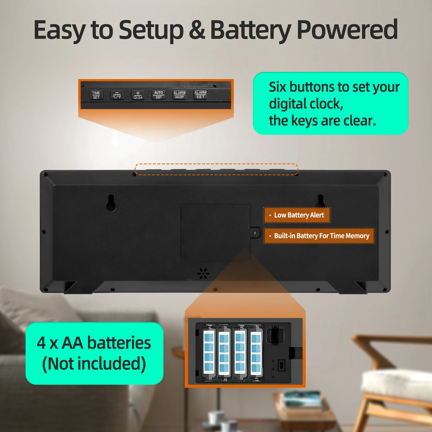 【EASY TO READ WITH BIG NUMBERS】Our digital wall clock has a 9.8x4.3 inch high-definition LCD screen and the time display is 6.7x4.3 inch. It helps you see clearly in a distance. You can also read the indoor temperature and date for full information.
